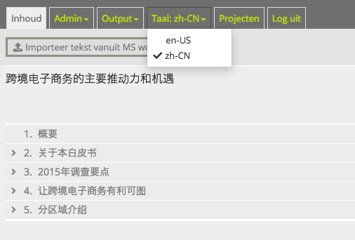 Bij het project komt dan een extra menu waarmee je de taal van het project kunt kiezen, Als je vanuit de inhoudsopgave voor het eerst naar een andere taal zie je dezelfde menu structuur en moeten daar de titels nog ingevuld worden.